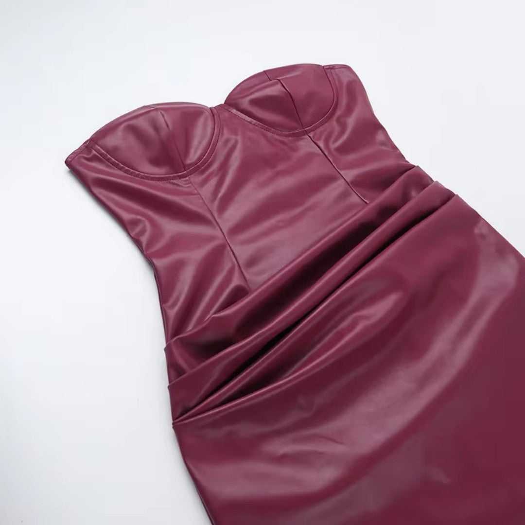 L’Abito Passion Empire combina sensualità e raffinatezza. Il tessuto in pelle PU, la scollatura a V senza bretelle e la silhouette aderente esaltano le curve, mentre il girovita empire e lo spacco elegante aggiungono un tocco sofisticato. Ideale per lasciare il segno.