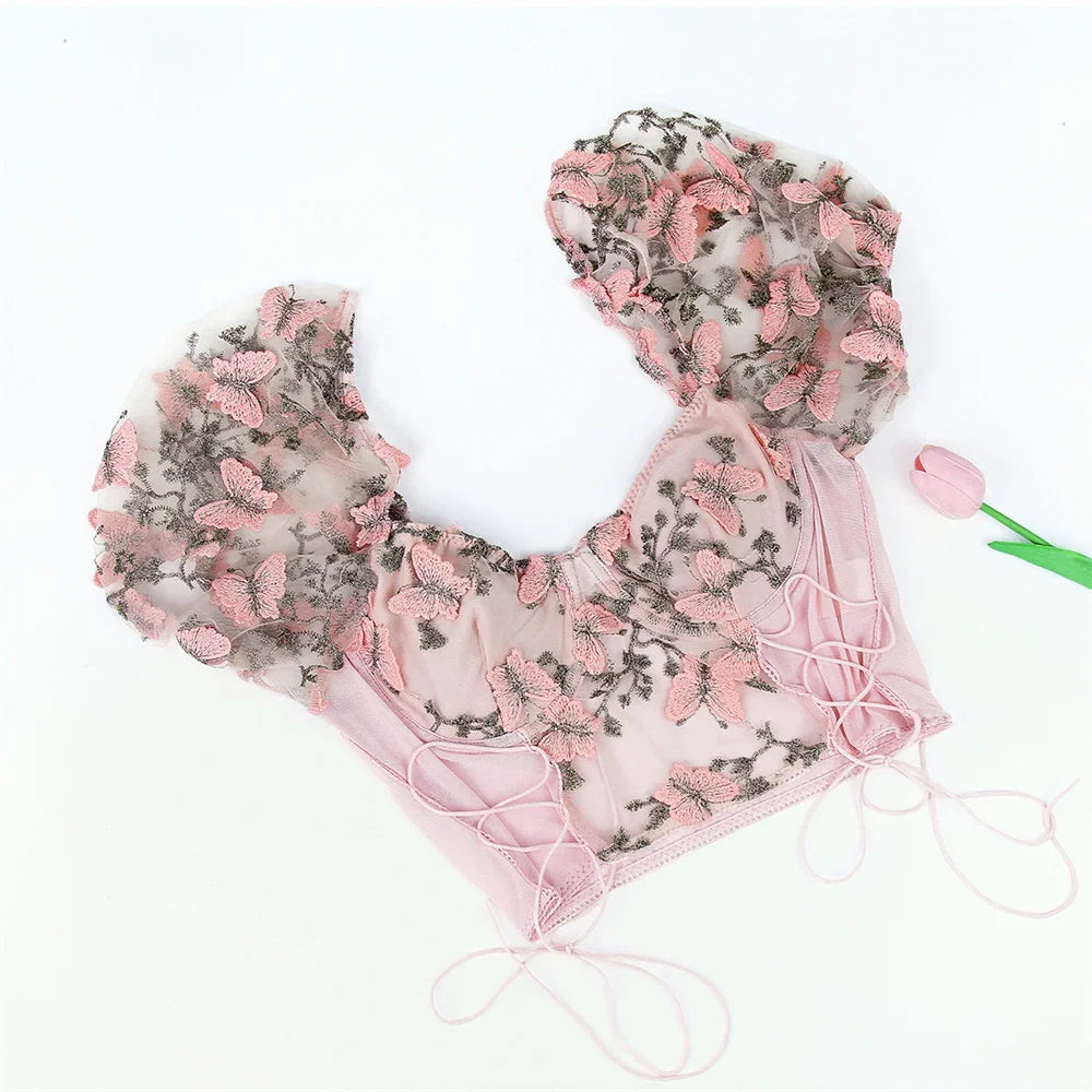 Lasciati incantare dalla delicata leggerezza del nostro Top Blossom Butterfly. Un ricamo a farfalla, realizzato con maestria, fluttua sulla tua pelle come un'ala appena posatasi.